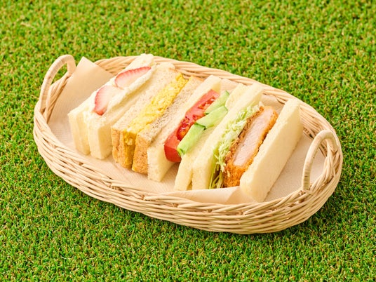 新作は、行楽シーズンを彩る4種の詰め合わせ。香ばしいブランパンで包んだタマゴサラダサンド、ジューシーで食べ応え抜群の三元豚カツサンド、みずみずしいトマトとキュウリが爽やかなサラダサンド、いちごと生クリームのデザートサンドまで揃えた、贅沢なセットです。野菜・肉・スイーツのバランスも良く彩りもあざやかで、ピクニックや新幹線での気軽なランチにおすすめです。