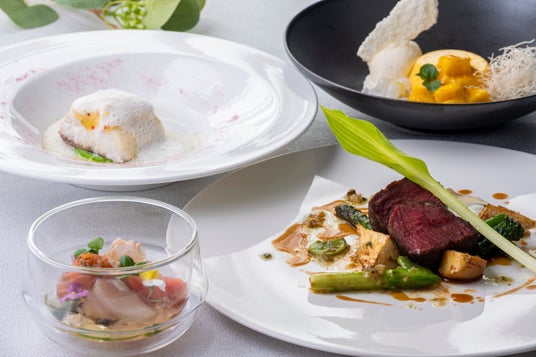 当ホテル料理長 長谷川は、本コースを「ジャルダン ドゥ プランタン(春の庭)」と題し、春の花々が彩り、芽吹く新芽を思わせるやわらかな緑が広がる、そんな「穏やかな春を感じさせる庭」をテーマに構成したフレンチコースです。食材それぞれの個性を大切にしながら、春らしく明るく華やかな色合いで表現しました。みずみずしい春の恵みを感じるひとときをお届けします。