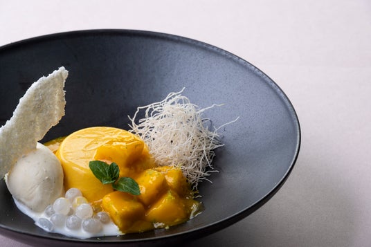 コースの締めくくりには、春に咲く黄色の花をイメージし、春から初夏にかけて旬を迎えるマンゴーを使ったプリンをご提供します。マンゴー本来のおいしさを存分に味わっていただきたいとの思いから、果肉はライム風味のマンゴーソースでマリネし、爽やかな味わいに。またもちっとした弾力のあるタピオカやココナッツミルクをあしらい、絶妙なハーモニーをご堪能いただける一品に仕上げました。