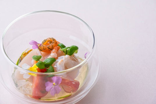 春の明るい色彩を思わせる色鮮やかな冷前菜をご紹介。白ワインジュレを敷き、赤海老、鮑、平貝といった食材に、マリネしたフルーツトマトを合わせ、ほど良い酸味をプラスしました。エディブルフラワーやマイクロリーフをあしらい、春の庭に咲く小花を表現しました。
