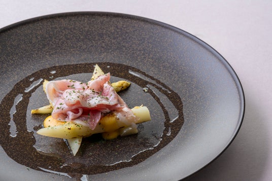 ディナーコースのメインを飾る一皿では、もも肉の一部ながら非常にやわらかく、きめ細やかな肉質と濃厚な旨味が特徴の「和牛ランプ肉」をオーブンにてじっくりと焼き上げました。アスパラや筍、渦巻き状の若芽が特徴的な「こごみ」といった春野菜を用い、春に芽吹く草木をイメージしました。玉ねぎの甘みと牛肉の出汁を合わせた泡状のエスプーマと、牛肉の旨味を閉じ込めたジュドブッフのソースをアクセントにご堪能ください。