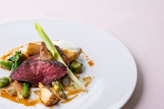 【ディナー 料理】「和牛ランプ肉のロティ 春野菜のブレゼと新玉ねぎのエスプーマ」