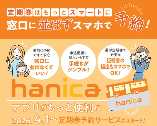レシップホールディングス株式会社(本社:岐阜県本巣市、代表取締役社長:杉本 眞)の連結子会社レシップ株式会社(本社:岐阜県本巣市、代表取締役社長:北野 元昭、以下:レシップ)は、阪急バス株式会社(本社:大阪府豊中市、社長:三田 和司、以下:阪急バス)にて利用できる「hanicaアプリ」において、定期券予約機能を追加し、2026年4月1日よりサービスを開始することをお知らせします。