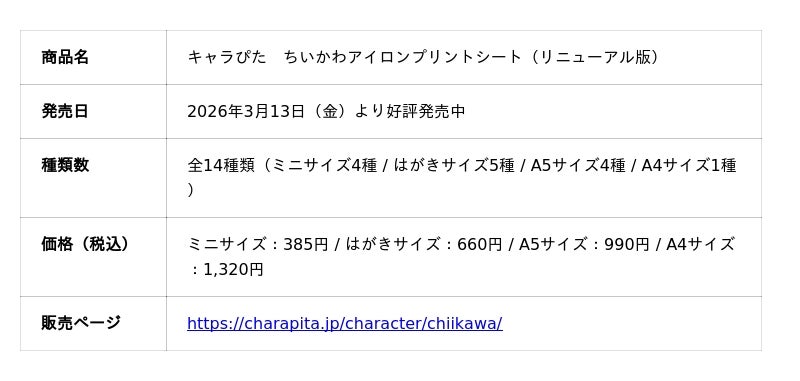 株式会社イメージ・マジック(本社:東京都文京区、代表取締役社長:山川誠)が展開するキャラクタープリントシート「キャラぴた」より、「ちいかわ」アイロンプリントシートの新デザイン全14種を、2026年3月13日(金)より販売開始いたしました。