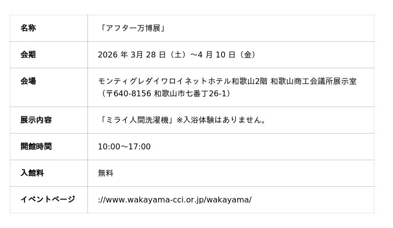 ファインバブル技術で社会課題の解決を目指すインフラ企業、株式会社サイエンス(本社:大阪府大阪市、代表取締役社長:水上 康洋、以下 当社)は、和歌山商工会議所の移転に伴い新設される展示室のオープニング特別企画「アフター万博展」において、「ミライ人間洗濯機」を和歌山県で初展示いたします。今回の和歌山での展示は、万博で提示した未来のライフスタイルを、実際の地域社会に浸透させるための重要なマイルストーンです。 当社は本展示を通じ、万博のレガシーを次世代へと繋ぎ、心身ともに健やかな暮らしを支える新たな入浴インフラとして、"カラダもココロも自動で洗われる"未来の入浴体験の社会実装を加速させてまいります。