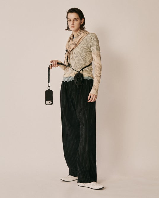 「beautiful people」のロゴを素押ししたヘッドバンドに、objcts.ioの人気アイテム『レザーパース』と『ソフトバックパック ベビーサイズ』を左右非対称に配した、ウェアラブルなiPhoneアクセサリー。有線ケーブルを思わせるコイル状のレザーストラップを搭載し、カラビナ付きiPhoneケースと連結することで、iPhoneを身に纏う新たなスタイルを提案します。