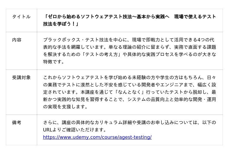 今回の選定により、AGESTの講座は個人の受講生だけでなく、企業の従業員研修としても広く利用されることとなります。「企業の現場で役立つ、高品質で信頼できるコンテンツ」として公式に認められたものであり、ソフトウェアテスト分野における当社の知見と教育品質が高く評価されたものと考えております。当社は今後も、ソフトウェアテストの知見を活かした高品質な教育コンテンツの提供を通じて、個人のスキルアップおよび企業の人材育成に貢献してまいります。