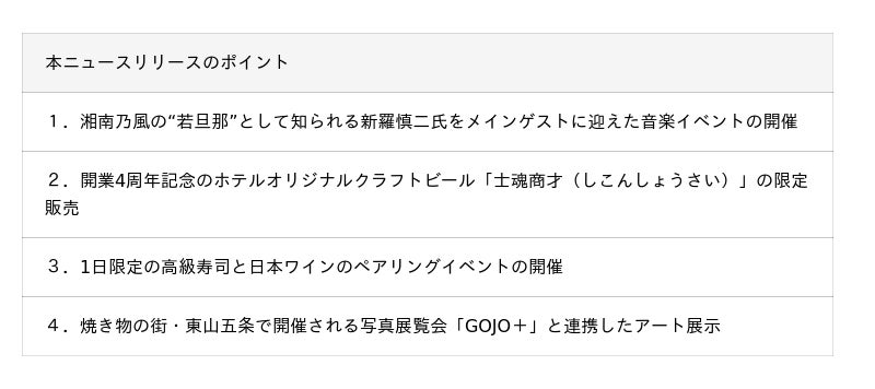 野村不動産ホテルズ株式会社(本社:東京都港区/代表取締役社長:石井康裕、以下「当社」)が運営する「ノーガホテル 清水 京都(以下「ノーガホテル京都」)」は、2026年4月1日(水)に開業4周年を迎えるにあたり、ノーガホテルブランドがキーワードとしている「音楽・アート・食」をテーマにした4つの特別企画を実施いたします。