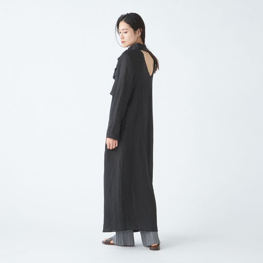 首元のディテールが印象的な、大人のためのワンピーススタイリング。