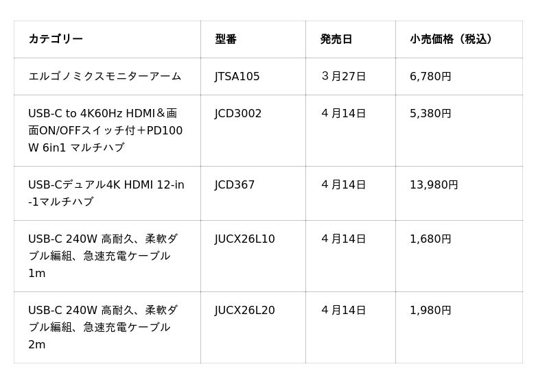 PC周辺機器のグローバルブランド j5createは、ユーザーの利便性を極限まで高めた新製品5種を本日より順次発売いたします。回転式モバイルスタンドから次世代240W充電ケーブルまで、機能美を追求したラインナップで、現代の多様化するワークスタイルとデバイス環境に対応する新製品5SKUを発表いたしました。