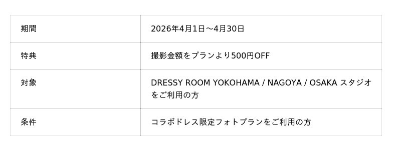 セルフ写真館 PICmiiは、カメラ専門店「カメラのキタムラ」のグループ会社として、撮影画質の仕上がりにこだわったセルフ写真館で、個室での自由な撮影をお楽しみいただけます。DRESSY ROOM YOKOHAMA/NAGOYA/OSAKAスタジオでは、4月限定で『新しい私、春のドレス割』を実施。4/1~4/30の期間、コラボドレス限定フォトプランをご利用の方にご利用料金より500円OFFとさせていただきます。(記事を見た旨をお伝え下さい。)