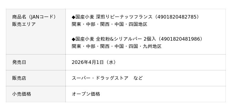 敷島製パン株式会社(Pasco)は、『和小麦』ブランドを代表する「国産小麦」シリーズの新商品として、「国産小麦 深煎りピーナッツフランス」「国産小麦 全粒粉&シリアルバー 2個入」を2026年4月1日(水)より発売します。