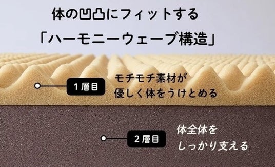 快適さと寝姿勢サポートを両立するため、異なる2素材を組み合わせた「ハーモニーウェーブ構造」を採用。モチモチとした触感の上層部がやさしく体を受け止めて圧力を分散させ、下層部が上層部の荷重を吸収して体全体をしっかりと支えます。