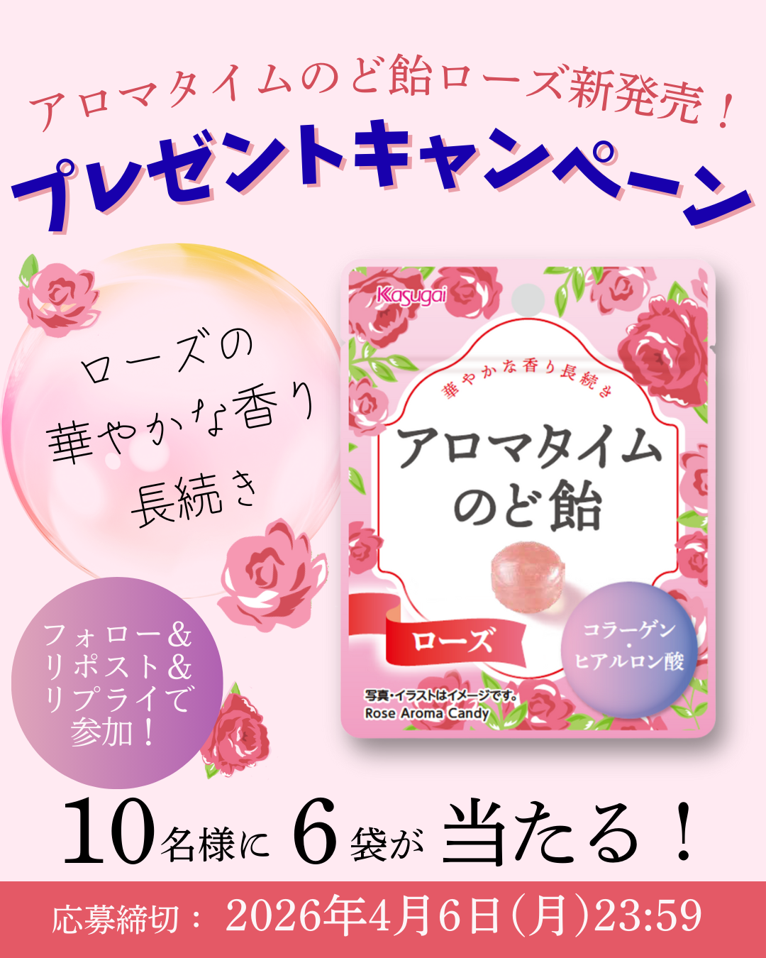 「アロマタイムのど飴 ローズ」の発売を記念して、春日井製菓公式Xにて本商品が当たるキャンペーンを実施いたします。春日井製菓公式Xをフォロー、キャンペーン投稿をリポスト、「アロマタイムローズ」とリプライした方の中から抽選で、10名様に「アロマタイムのど飴 ローズ」6袋をプレゼントいたします。【応募期間】