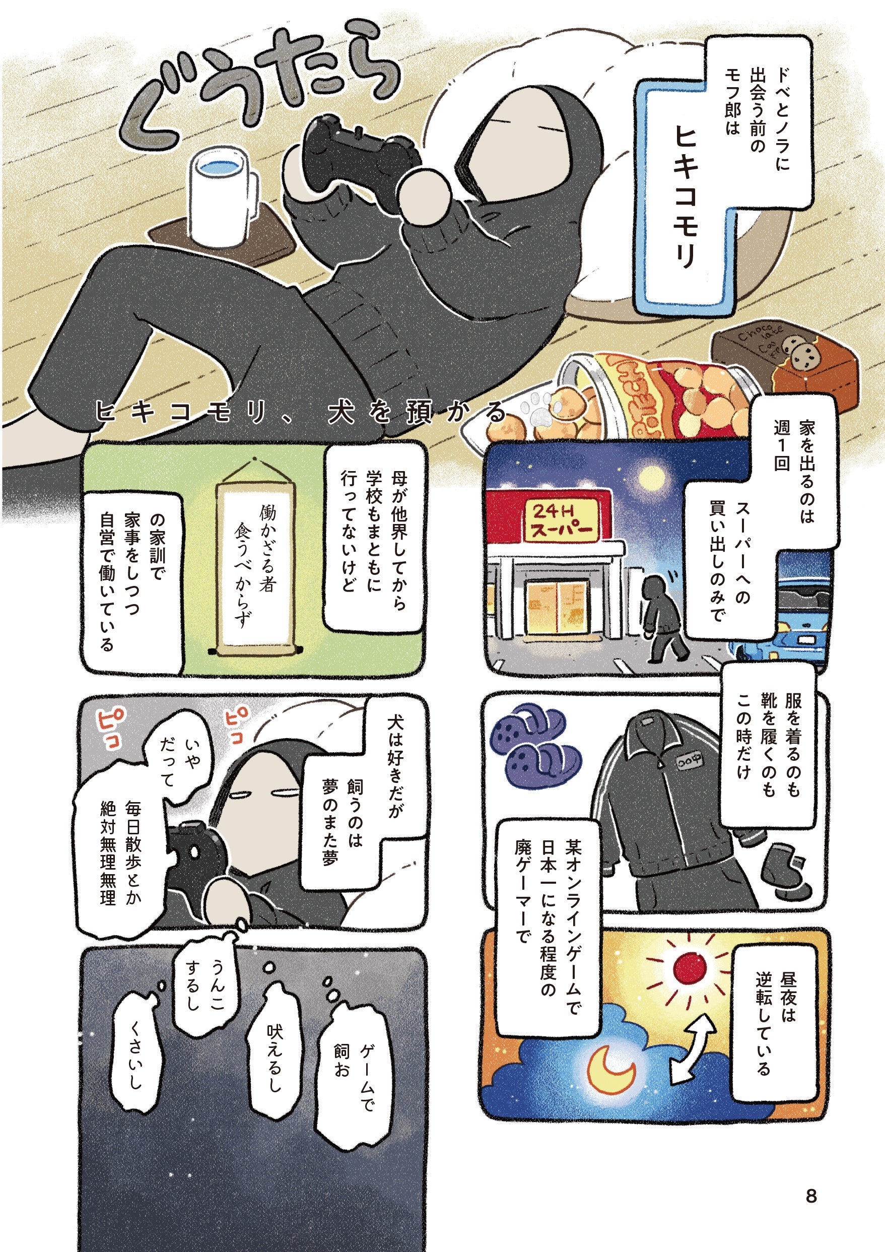 ヒキコモリ生活を送るモフ郎。昔から犬を飼いたいという思いはあったが、自称"動物嫌い"の父に反対され、何よりヒキコモリの自分には無理だと諦めていた。