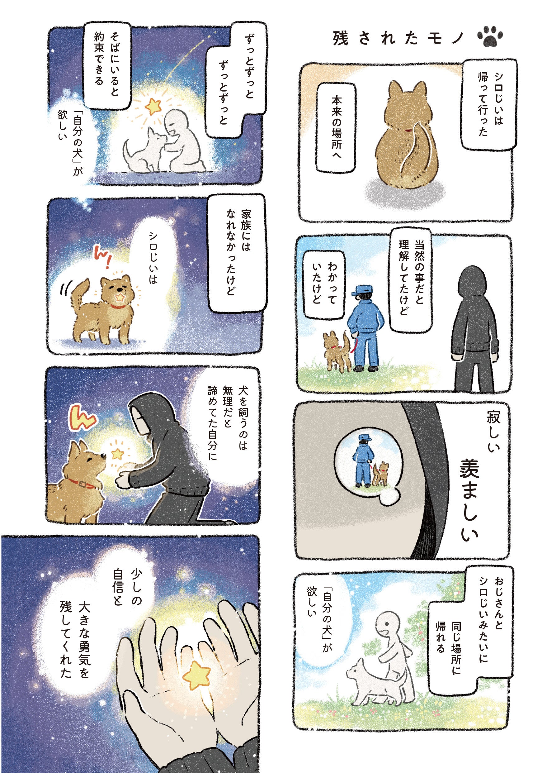 そんなドベが虹の橋を渡り、その後に出会ったノラと家族になっても、ドベに教えてもらった優しい世界はずっと変わらないし、ノラといるとドベを近くに感じることができる。