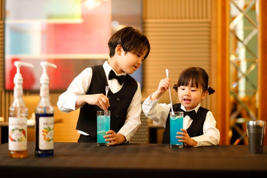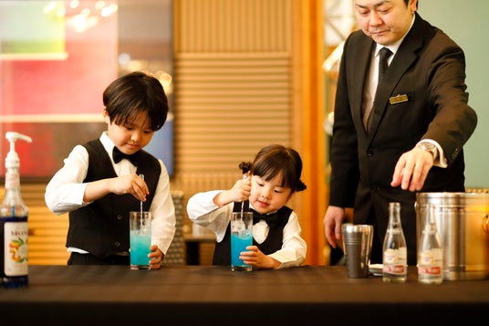 「チャイナ・ブルー」は、ライチシロップ、ブルーキュラソー、グレープフルーツジュース、トニックウォーターを使用した、さわやかな香りが広がる一杯。氷を入れたタンブラーに材料を注ぎ、軽く混ぜる「ビルド」という手法で作成します。完成したドリンクはご家族へプレゼント!お子さま自身用のドリンクも作り、ご家族で"乾杯"の時間をお楽しみください。