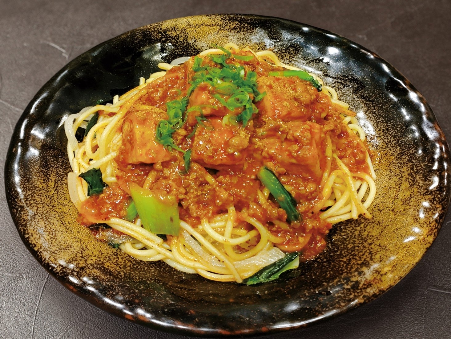 「厚揚げの四川風麻婆豆腐 焼きスパ」は、タマネギ、小松菜とともに炒めたスパゲティに、崩れにくく香ばしさも楽しめる厚揚げを使用し、本場四川豆板醤と合挽肉の旨味で奥行きのある辛さに仕上げ特製の四川風麻婆豆腐をトッピングした一品。仕上げにラー油と花椒パウダーを効かせ、ピリッとした辛味と心地よい痺れが後を引く味わいを、モチモチ食感のスパゲティにしっかり絡めてお召し上がりください。中華の力強い旨味と焼きスパゲティの香ばしさが重なった、食欲を刺激する旨辛メニューです。