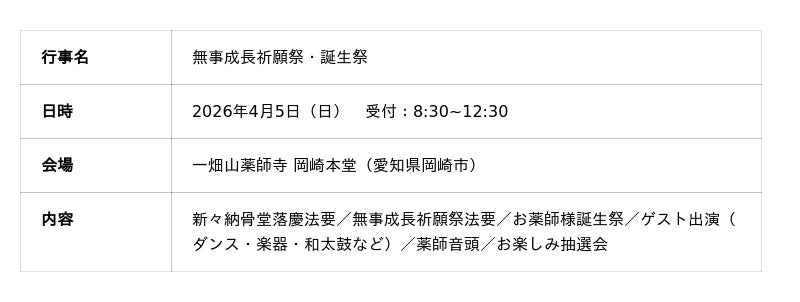 一畑山薬師寺は、2026年4月5日(日)、岡崎本堂にて「無事成長祈願祭・誕生祭」を厳修いたします。