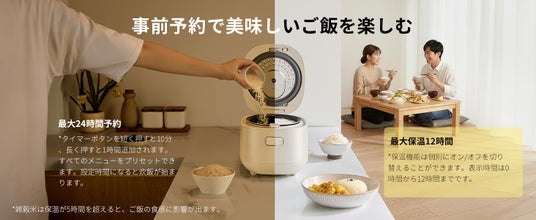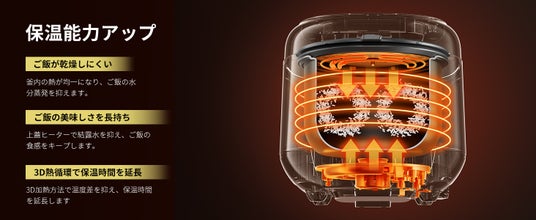 トップボトム式加熱で釜内の熱を均一に保ち、水分の蒸発を抑えるため、ご飯が乾きにくく、ふっくら感を長時間キープします。上部からも加熱されることで蓋の結露を抑え、米の食感や風味を長く保ちます。最大12時間の保温が可能で、時間が経ってもおいしいご飯を楽しめます。