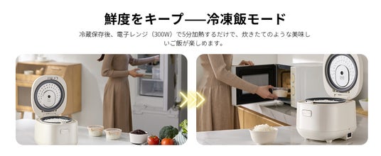 「白米・無洗米・雑穀米・冷凍ごはん」の炊飯4メニューに加え、「お粥・スープ・蒸し料理・プリン」の調理4メニューも搭載します。一台でさまざまな料理に対応可能です。特に冷凍ご飯モードでは、一度炊いたご飯を冷蔵保存した後でも、電子レンジで簡単に温めるだけで、まるで炊きたてのような食感を楽しめます。忙しい日やまとめ炊きにも便利な機能です。