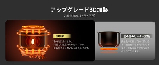 従来の底面加熱に加え、上部からも加熱するトップボトム式を採用します。多方向から加熱することで、釜内の温度を均一に保ち、加熱ムラを抑え、お米一粒一粒までムラなくふっくらとした炊き上がりを実現します。毎日のごはんを、より美味しく楽しめます。