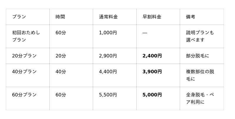 20分=ワキ・腕など1~2パーツ、40分=複数部位、60分=全身またはペア利用に適しています。