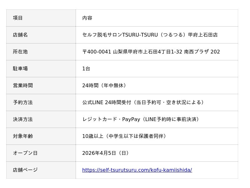 株式会社ココカラ(所在地:静岡県富士市、代表取締役:飯田 隆)は、2026年4月5日(日)、山梨県甲府市上石田に「セルフ脱毛サロン TSURU-TSURU(つるつる)甲府上石田店」をオープンいたします。静岡県内で直営2店舗を展開してきたTSURU-TSURUが、フランチャイズ全国展開の第1号店として山梨県に初進出。