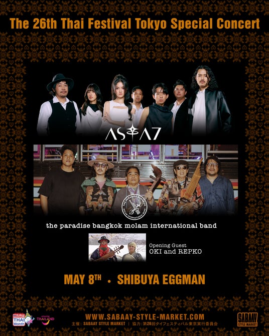 2026年5月5日(火・祝)と、5月8日(金)から5月10日(日)の計4日間、渋谷Eggmanにてタイフェスティバル東京のスペシャルプログラムとして、タイ音楽・カルチャーを多角的に発信する「Sabaay Style Market」がお届けする『- The 26th Thai Festival Tokyo Special Concert -』を開催いたします。