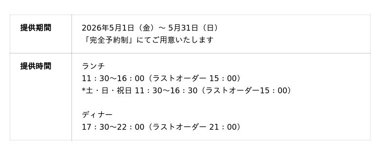 2026年5月1日(金)~5月31日(日)までの期間限定・完全予約制で提供