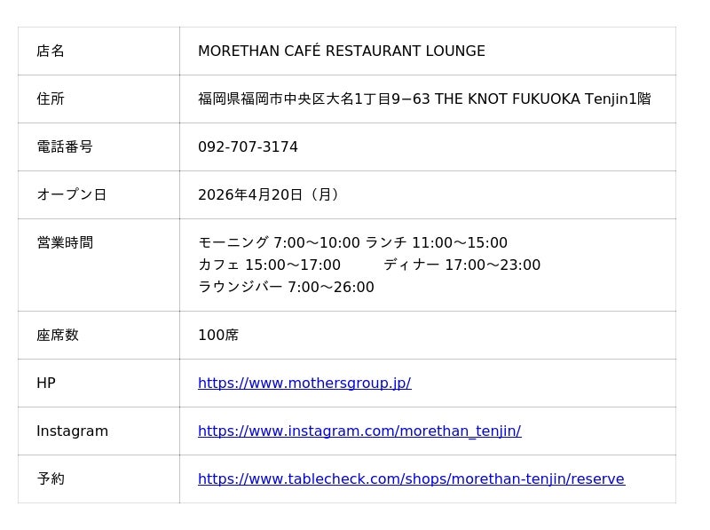 株式会社MOTHERS、福岡初の「MORETHAN CAFE RESTAURANT LOUNGE」を4月20日(月)オープン