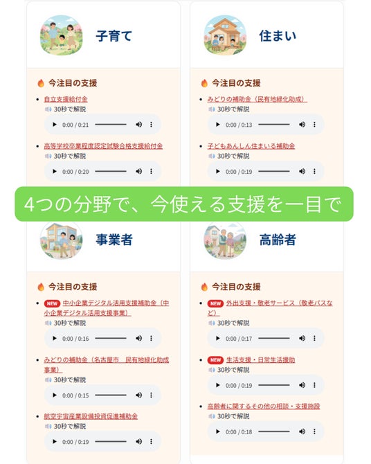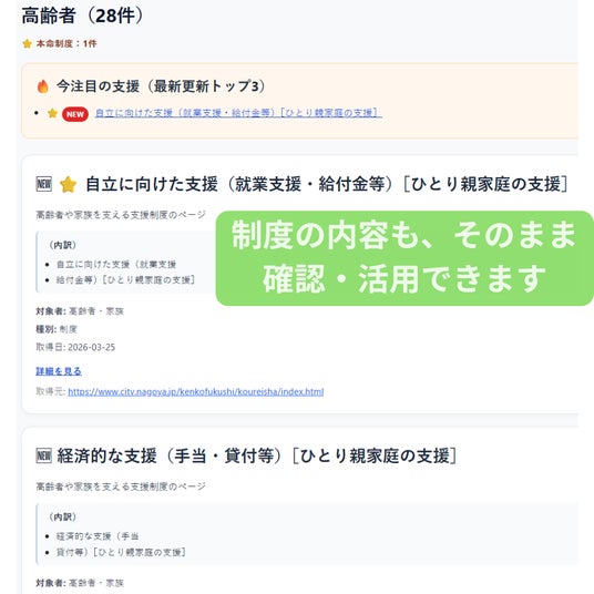 この課題を解決するために、名古屋市の支援制度を毎日自動で整理する