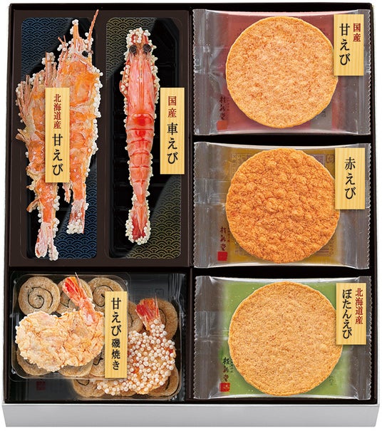 海老づくし桂新堂を代表する海老菓子である「あられ焼き」「姿焼き」「磯焼き」「炙り焼き」を詰め合わせました。