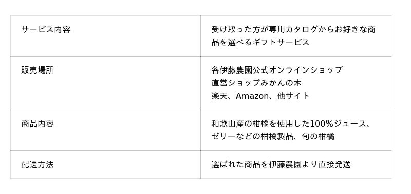 株式会社伊藤農園(本社:和歌山県有田市)は、「みかんのカタログギフト」を開始しました。受け取った方はカードに記載されたQRコード、もしくはURLから専用カタログにアクセスし、和歌山産の柑橘を使用したジュースやゼリーなど、伊藤農園こだわりの商品を自由に選ぶことができます。受け取った方が選ぶ楽しさを備えた新しい柑橘ギフトとして展開していきます。