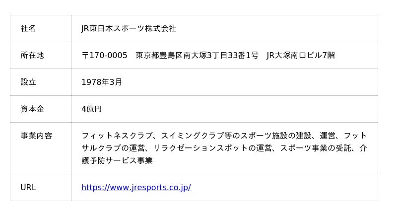 〇JR東日本スポーツ株式会社(本社:東京都豊島区、代表取締役社長:穴吹昌弘)は「からだとココロの健康づくりに貢献する」を企業理念に掲げ、首都圏・東日本エリアに総合フィットネスクラブ「ジェクサー・フィットネス&スパ」、小型ジム「ジェクサー・ライトジム」、 リラクゼーションスポット「リラクゼ」などの施設を展開しています。
