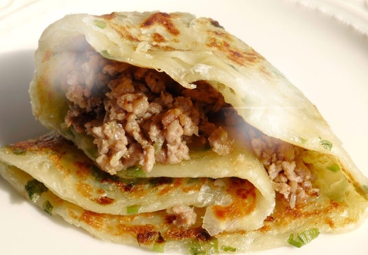 中華圏全体でよく食べられている「葱油餅」は、小麦粉を練った生地に葱と油を練り込み、ピザのように薄く延ばし、鉄板で焼いたものです。家庭や食堂で定番の軽食です。横濱東風軒の「葱肉巻餅(ねぎにくまきもち)」は、特製ソースでひき肉と旬の野菜を炒め、この「葱油餅」で巻いたものです。