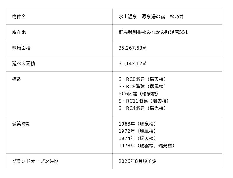 新規運営物件につきましては、改修工事を行い2026年8月頃に大江戸温泉物語Premiumシリーズとしてオープンを予定しております。大江戸温泉物語Premiumシリーズは家族の楽しい時間も、大人のくつろぎ時間も諦めることなく満喫できる宿として全国に展開。訪れる方々に、思い思いの贅沢な宿泊体験をご提供いたします。大江戸温泉物語グループとして、群馬県での出店はPremium 伊香保に続き2施設目となります。