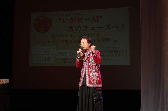 壇上で会社が目指す方向性や自身の深い自己紹介を語る五十嵐社長