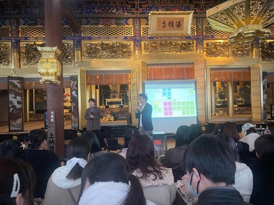 そしてその実施場所にも工夫が。今回会場として選ばれたのが、「陽願寺」。同寺は、地域の人々が集い、繋がりが生まれる場所であってほしいという想いから様々なイベント企画に場所を貸し出しており、これまでもファッションショーを開催するなどアイジーエーの取り組みにご協力いただいています。講演前に住職からその想いが語られ、学びの場そのものにも"地域とのつながり"を感じられる時間となりました。
