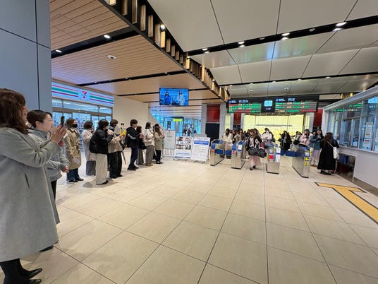 越前たけふ駅に到着する店長たちを福井本社スタッフが出迎えた