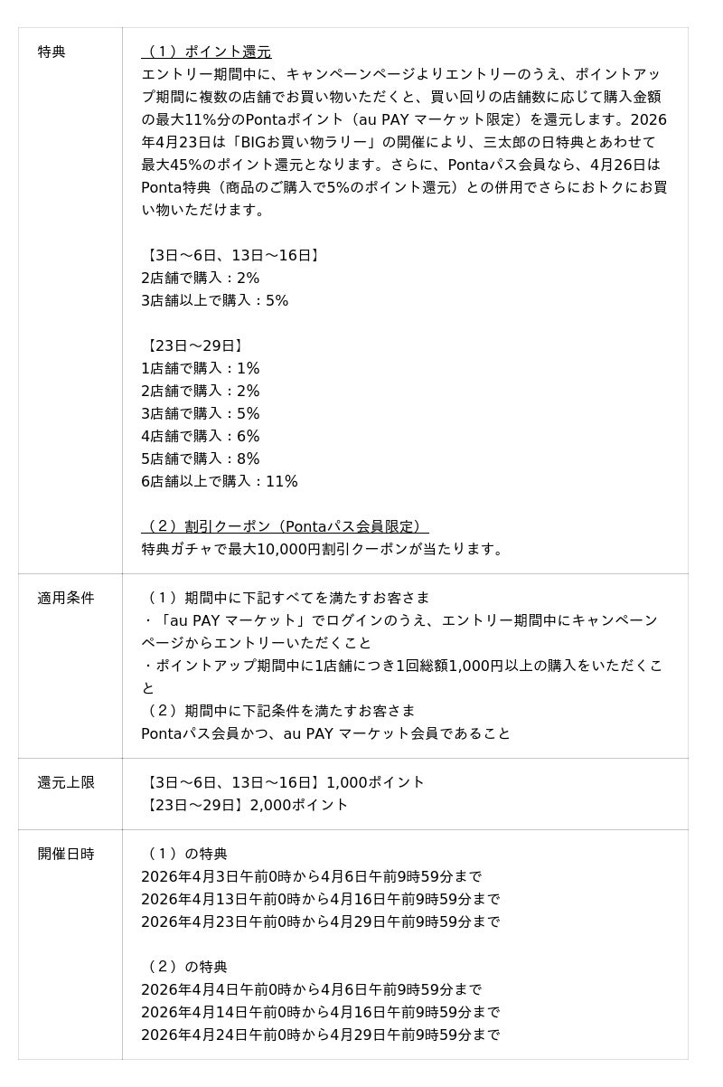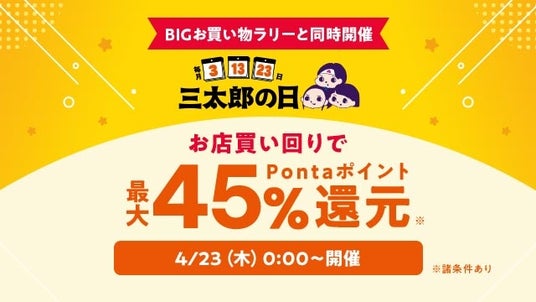 さらに、2026年4月13日午前0時から14日の午前9時59分まではポイント超超祭との同時開催により合計で最大46%のポイント還元となり、2026年4月23日は購入店舗数に応じて、還元率がアップする「BIGお買い物ラリー」の開催により、三太郎の日特典とあわせて最大45%のポイント還元となります。