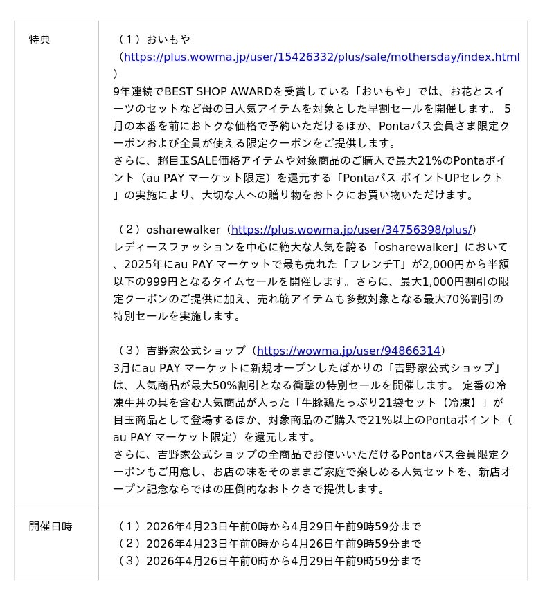 そのほか、3月に新規オープンしたばかりの吉野家が三太郎の日・お買い物ラリーのコラボレーションに初登場する衝撃企画をはじめ、おトクにご購入いただける割引クーポンの配布や、2025年au PAY マーケットで一番売れたTシャツが半額以下になるセールなど、新生活の家計を応援するおトクなラインナップで、暮らしが満たされるお買い物体験をお届けします。