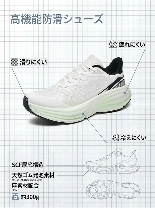 本製品は、防水機能を目的としたものではなく、雨の日の横断歩道、駅構内の濡れた床、雪解け道など、日常の中にある「滑りやすい環境」において、歩行時の安定性に配慮して設計されたシューズである。