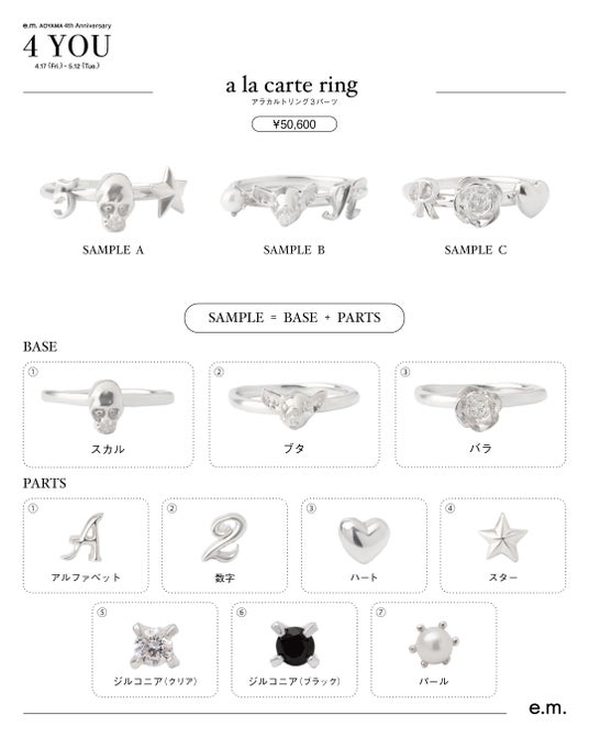 ジュエリーブランド【e.m.】を運営するイー・エム・デザイン株式会社は、2026年4月17日(金)~5月12日(火)の期間中「4 YOU」と題し、e.m.青山店のグランドオープン4周年を記念した限定イベントを開催します。