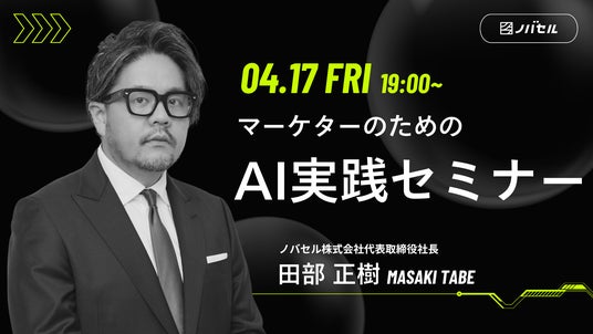 企業の事業成長を支援するAIエージェンシー、ノバセル株式会社(本社:東京都港区、代表取締役社長:田部正樹、以下ノバセル)は、4月17日(金)19:00~20:30、ノバセル 麻布台オフィスにて、オフラインセミナー「明日から実務が変わる!マーケターのためのAI実践セミナー」(URL:https://novasell.com/seminars/ai-seminar-workshop)を開催いたします。