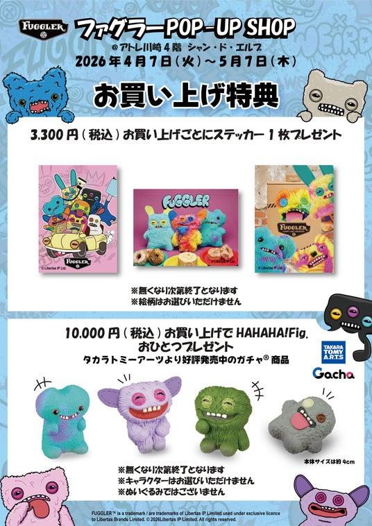 株式会社アトレ(本社:東京都渋谷区、代表取締役社長:高橋 弘行※)が運営する直営ショップ「シャン・ド・エルブ」の催事店舗「シャン・ド・エルブ川崎店」(所在地:神奈川県川崎市)にて、うつろな目にリアルな歯で世界中で人気をあつめる『ファグラー』のPOP-UP SHOPを2026年4月7日(火)から5月7日(木)まで開催します。2度目の開催となる今回は、先行商品の販売のほかワークショップのイベントも開催します。
