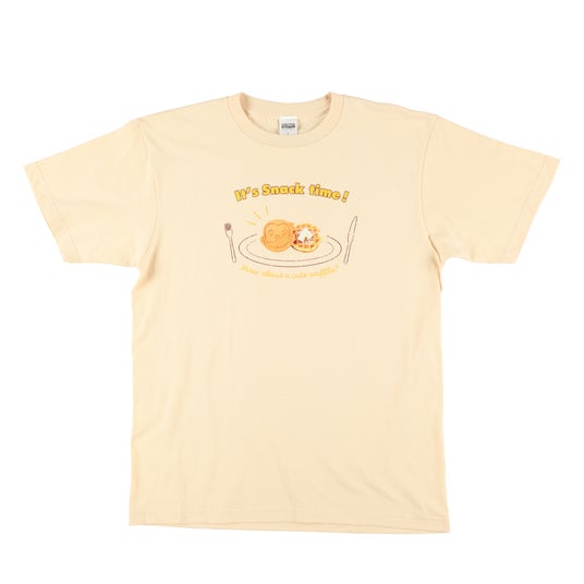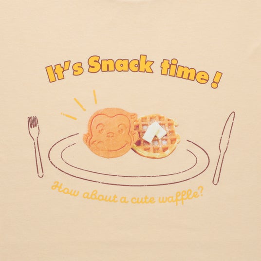 Curious George Kitchenにてテイクアウトのみ販売している「ジョージのお顔のワッフル」をデザインした3サイズ展開のTシャツです。フォークやお皿のアートとワッフルの実写を組み合わせたデザインに、くすみオレンジのカラーがシンプルなコーデに合わせるとおしゃれな着こなしになります。
