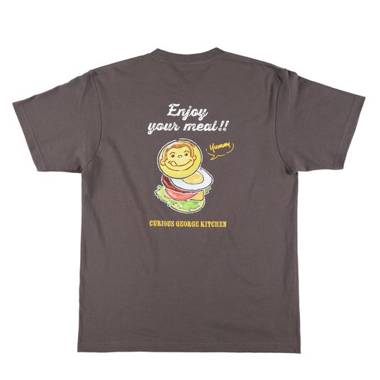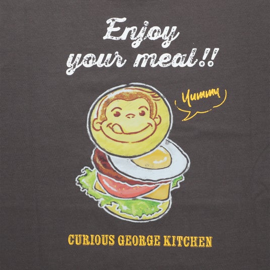 表面にシンプルなCurious Georgeの頭文字「CG」ロゴ、背面にCurious George Kitchenで定番の目玉焼きバーガーを黒板アート風にデザインしたTシャツです。カラーは合わせやすいスモークブラックの3サイズ展開で、男女問わず着用いただけます。