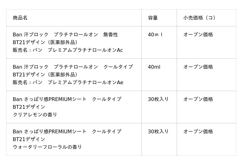 『Ban 汗ブロック プラチナロールオン 無香性』『Ban 汗ブロック プラチナロールオン クールタイプ』、『Ban さっぱり感PREMIUMシート クールタイプ クリアレモンの香り』『Ban さっぱり感PREMIUMシート クールタイプ ウォータリーフローラルの香り』の「BT21」デザインを数量限定で発売いたします。