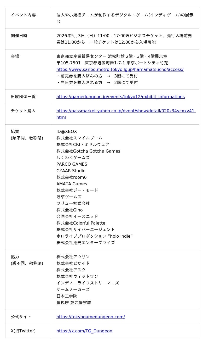 ゲームダンジョン事務局は、2026年5月3日(日)に開催するインディゲーム展示会「東京ゲームダンジョン12」に出展する410団体を本日公開しました。